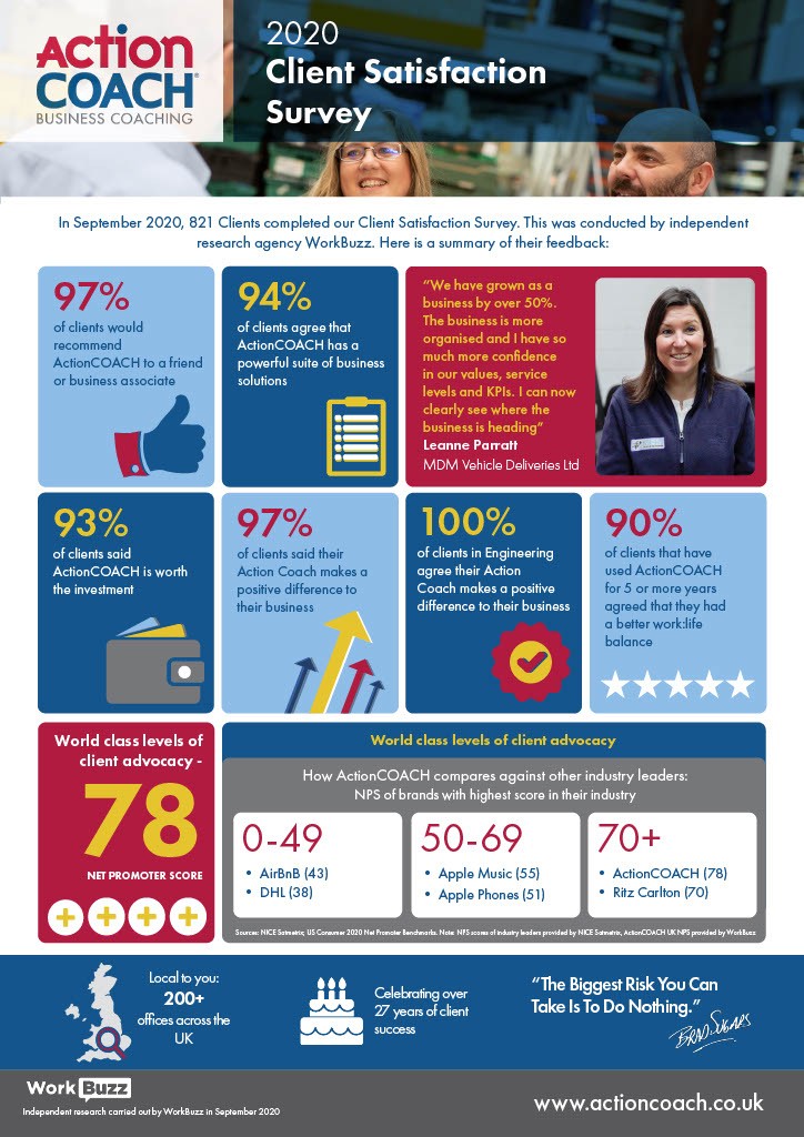 ActionCOACH was keen to gauge their clients’ responses across a range of different areas, so it also included questions about their experience with the franchise and their progress over time. According to the satisfaction survey, 97 percent of the brand’s clients said their ‘action coach’ makes a positive difference to their business.